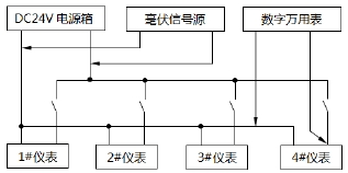 切斷24V 電源箱的供電,把24V電源輸出母線定為起點(diǎn)接入毫伏電壓信號(hào),用數(shù)字萬(wàn)用表在回路的終點(diǎn)4號(hào)儀表處測(cè)量毫伏電壓,測(cè)量其他儀表的操作方法也基本一致。