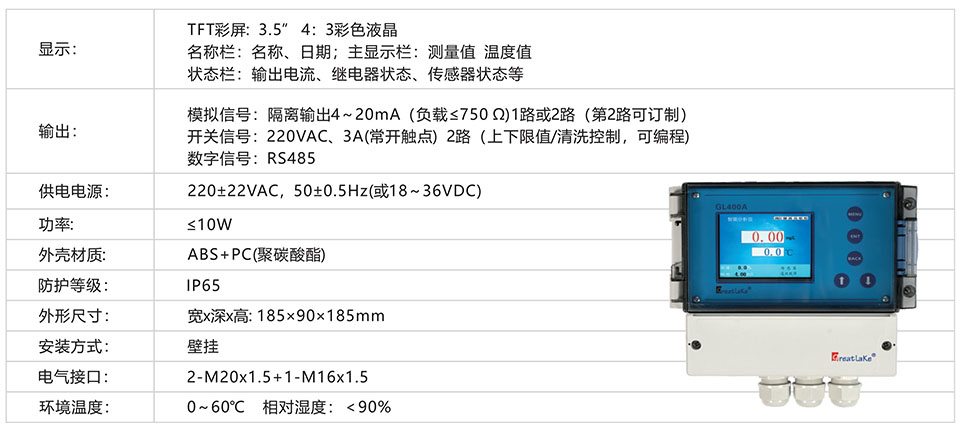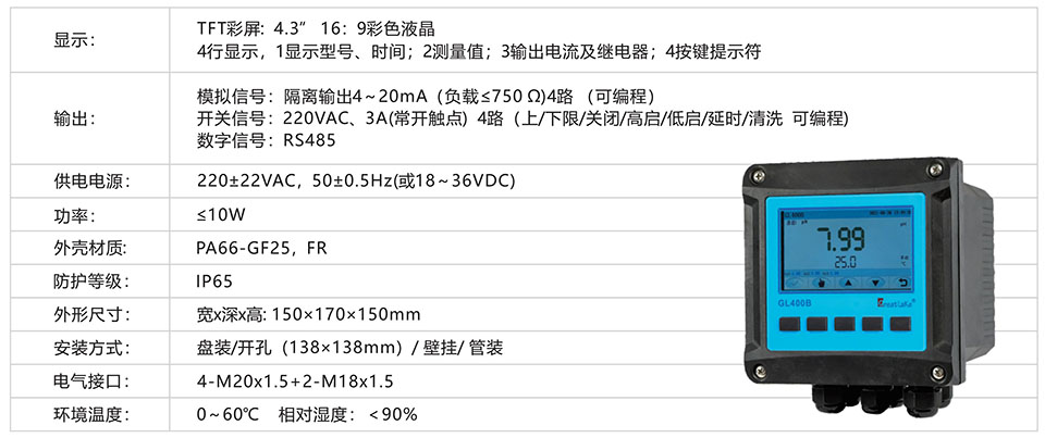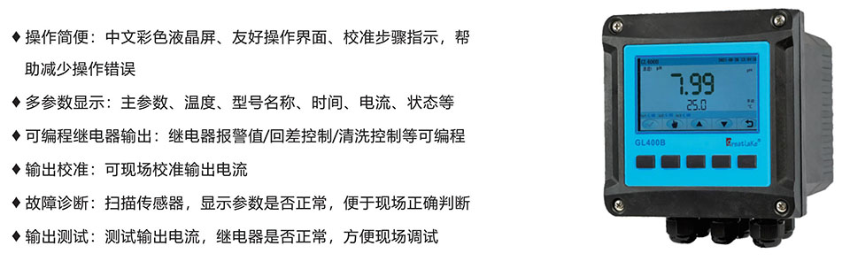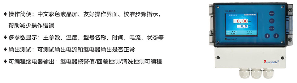 產品簡介: 智能分析儀GL400A他的功能特點有:中文彩色液晶屏、友好操作界面、校準步驟指示,幫助減少操作錯誤;主參數(shù)、溫度、型號名稱、時間、電流、狀態(tài)等;可測試輸出電流和繼電器輸出是否正常;繼電器報警值/回差控制/清洗控制可編程