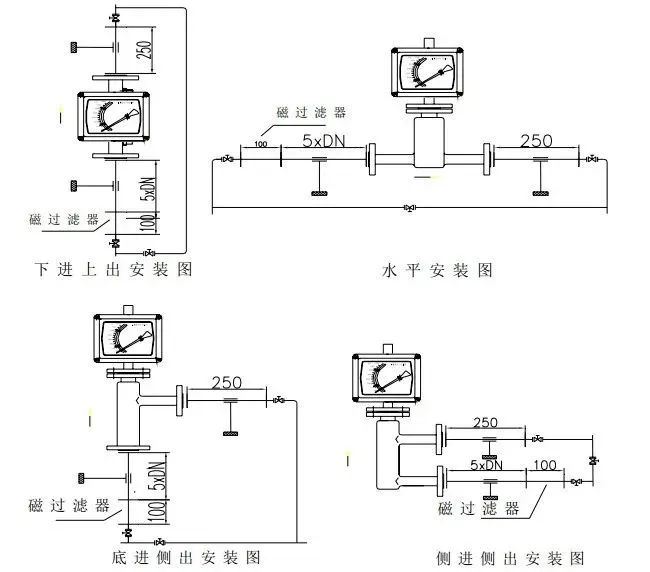 應在儀表上游裝過濾器。帶有磁性耦合的金屬管轉子流量計用于可能含磁鐵性雜質流體時,應在儀表前裝磁過濾器。要保持浮子和錐管的清潔,特別是小口徑儀表,浮子潔凈程度明顯影響測量值。