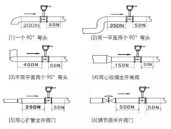 流量計上游端至少應有10倍公稱通徑長度的直管段,下游端應不少于5倍公稱通徑的直管段,其內壁應光滑清潔,無凹痕、積垢和起皮等缺陷。